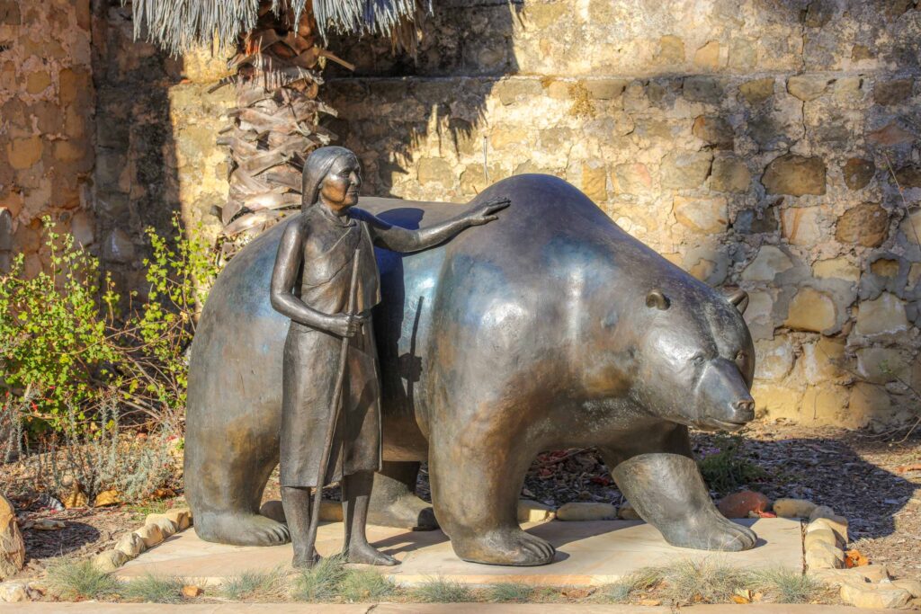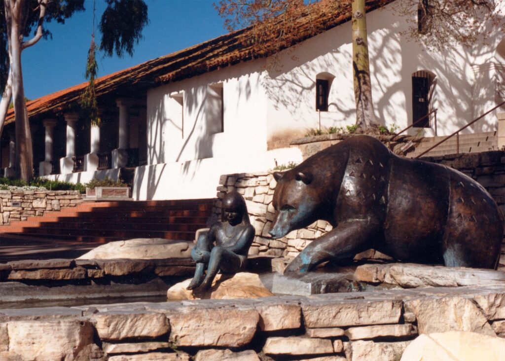 The title is Northern Chumash for Bear and Child. Life-sized, Bronze, commissioned by the past Mayor Ken Schwartz, Bea Von Stein and Myron Graham as gift to the city of San Luis Obispo, California. Installed in the plaza of the Mission de San Luis Obispo de Telosa. -1988
