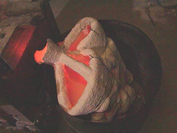 Once the shell is completely dry, it’s placed in a large kiln. The intense